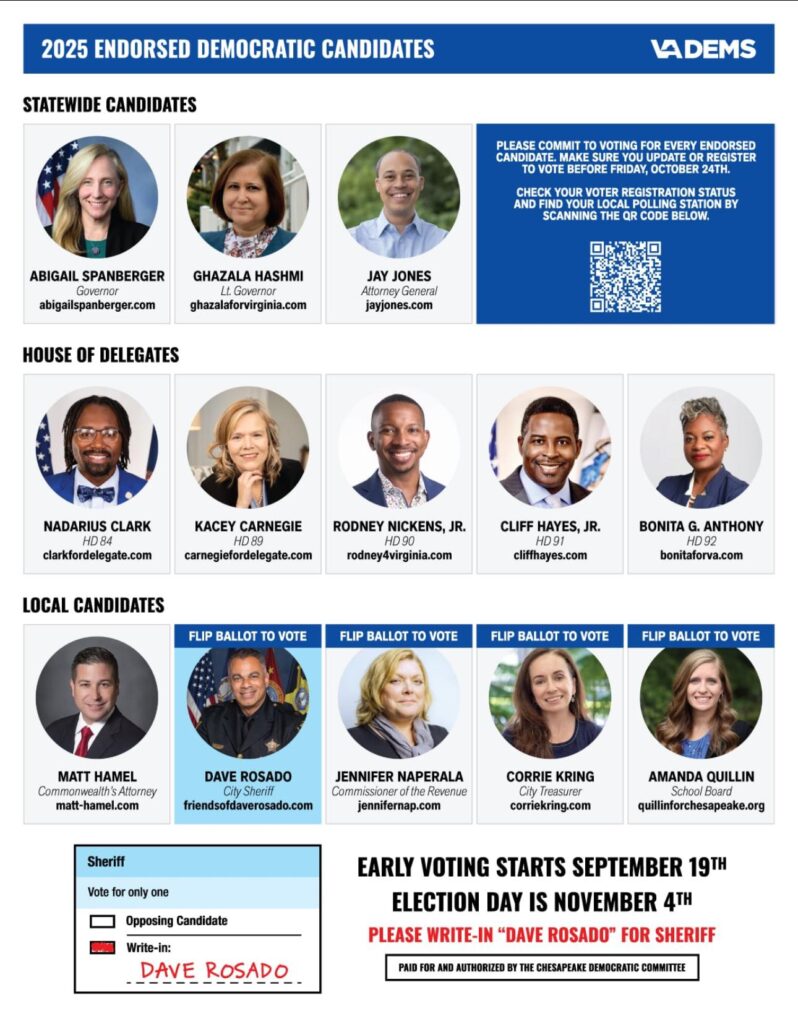 It is our civic duty to build and maintain a strong Democratic organization capable of promoting our values throughout the City of Chesapeake and the Commonwealth of Virginia.